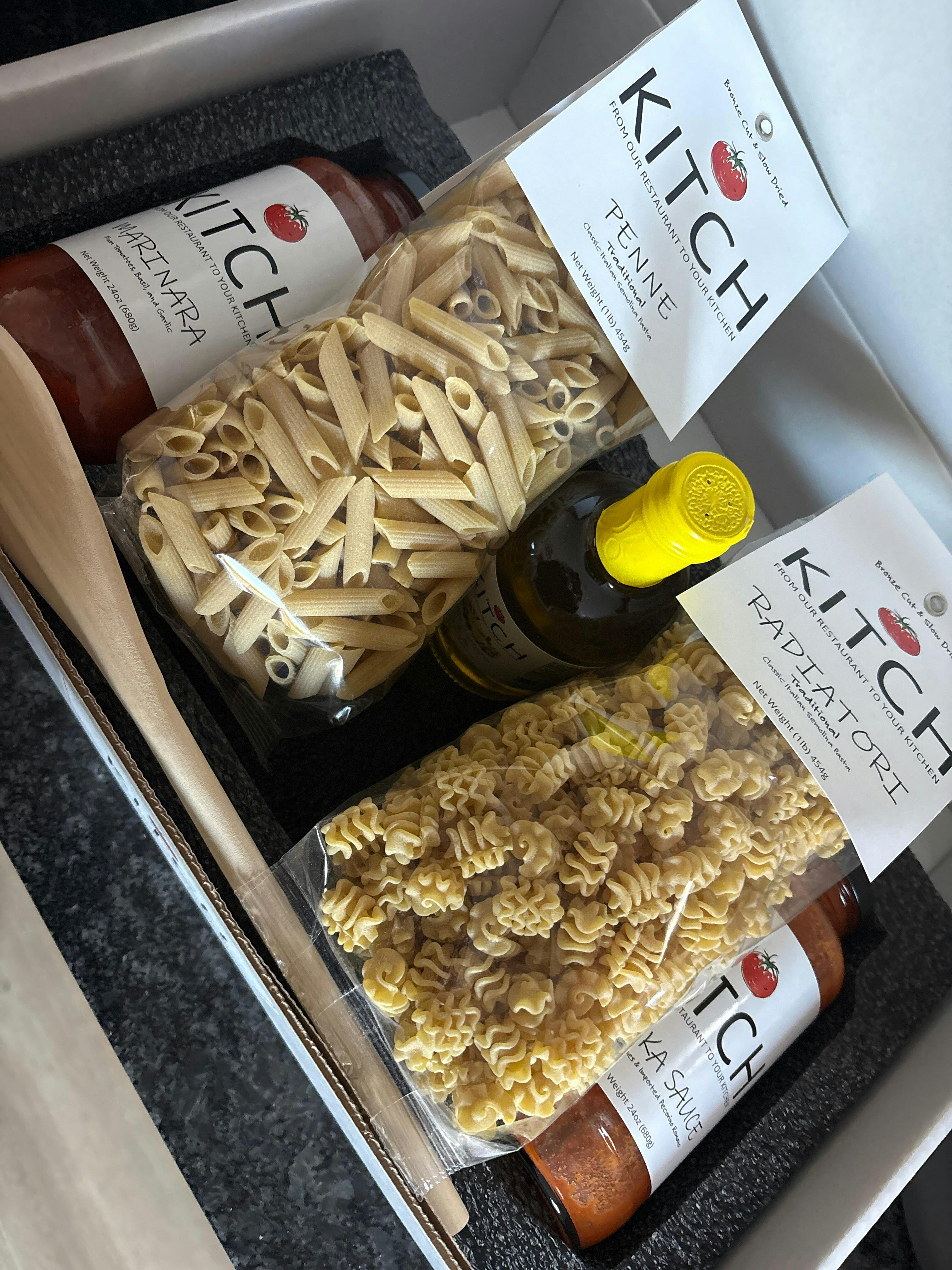 Elevate your gift-giving with our KITCH Kits, the ultimate present for any occasion. This thoughtfully curated gift box features rich vodka sauce and a flavorful tomato-basil marinara sauce, along with 1lb each of our expertly crafted bronze-cut and slow-dried penne and mezzi rigatoni pasta. To top it off, we've included a wooden spoon and our finishing Sorento lemon infused extra virgin olive oil. Make someone’s day memorable with this deliciously enticing gift!
